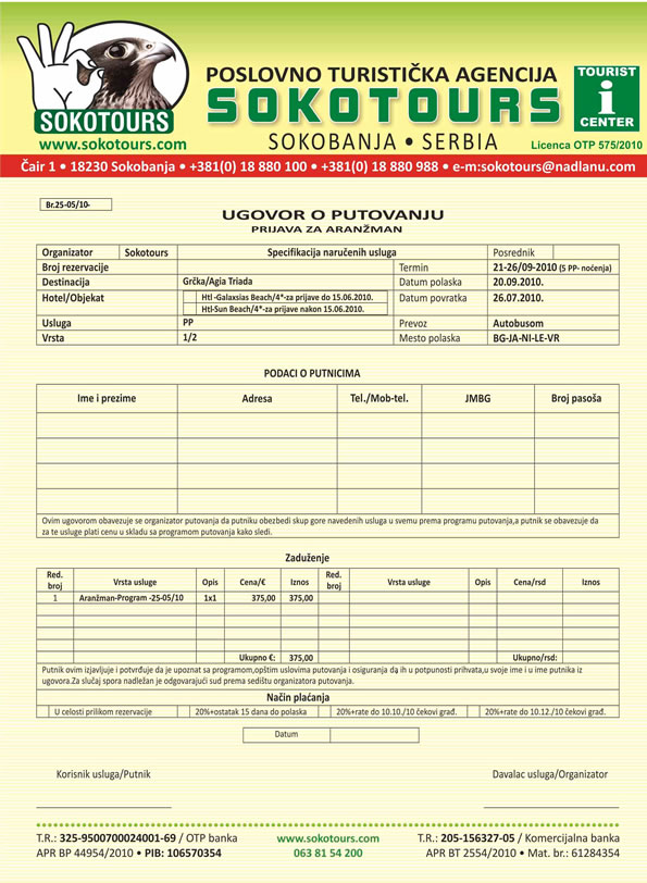 Rezervacija aranžmana vrši se preko prodajne službe PTA “Sokotours“ na tel: 018-880-100 i 018-880-101; mob: 063-81-54-200 , kao i na e-mail: sokotours@nadlanu.com uz obavezno dostavljanje popunjene i potpisane prijave za aranžman. (.doc fajl, 295KB)